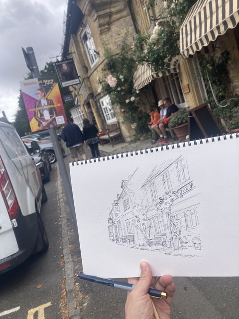 続いてストウ・オン・ザ・ワルド(Stow on the Wold)、どこを描くか迷いましたが、薔薇の花咲くお店を描いていると、雨がひどくなり少しカフェで休憩しました。古い建物の中はリノベーションされていましたが、古い木の柱などはそのまま生かされていました。