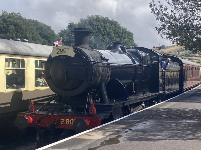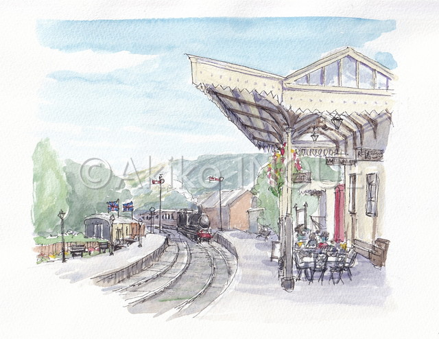 いい加減、石造りの家に飽きてきたので、蒸気機関車を見にウィンチカム(Winchcombe)へ。駅の窓口で汽車の写真を撮りたいと言うと(乗らないのに)快くホームに入れてくれ、ちょうど上りのホームには出発間際の汽車、下りはあと5分で到着するというグッドタイミング。観光列車から降りてきたお客さんたちも駅のホームにある博物館に寄ったり、赤い公衆電話で記念撮影をしたり楽しそうでした。駅にレストランがありホームのテーブルで軽食が食べられるのが面白くて1枚スケッチをしました。