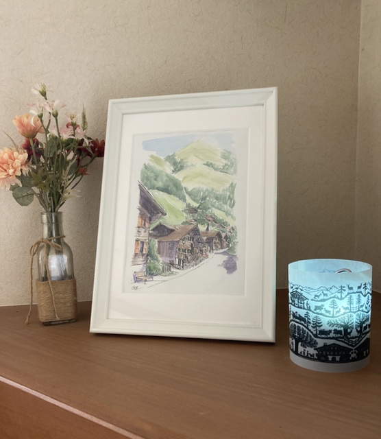 今回ご用意した作品は主にA4 サイズくらいの小さなスケッチ画。ペンと水彩絵具を使った爽やかな色彩で、フランスやイギリスの石造りの建物やスイスの山々が描かれ、飾った時のオシャレ感を重視して額装しました。