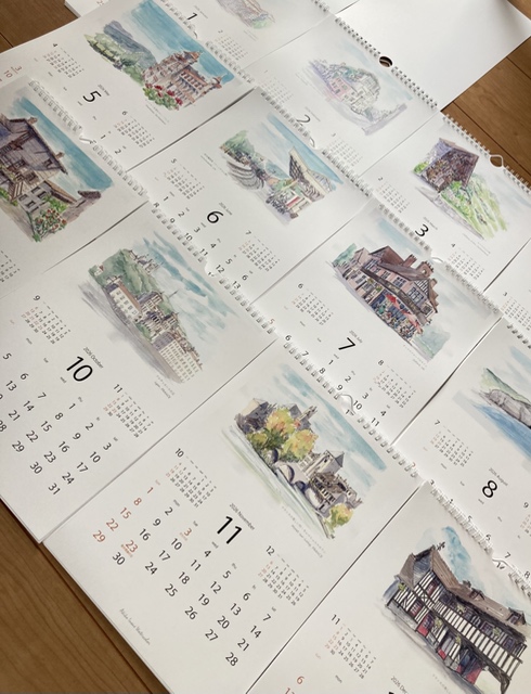 この度の個展では11月ということもあって、2026年のカレンダーをご用意しました。こちらは売り物ではなく、原画をご購入いただいた皆様にプレゼントいたします。毎月違ったヨーロッパの風景をお楽しみいただけるスペシャルなカレンダーです。