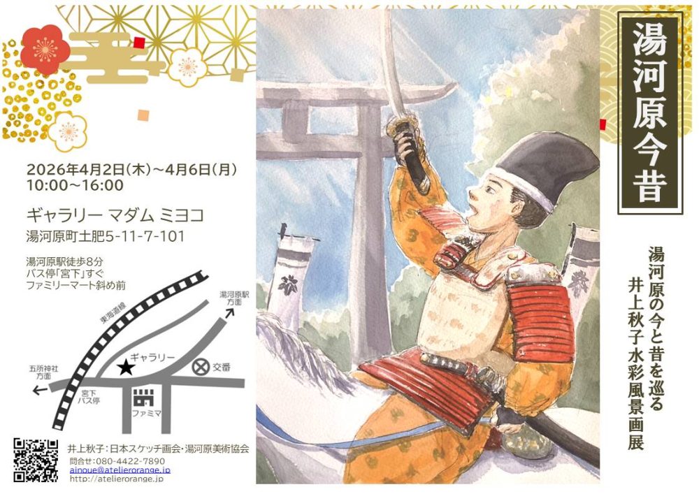 ちょうど湯河原では4月の最初の日曜日に「源頼朝旗揚げ武者行列」というイベントがあり盛り上がります。4月5日(日)は個展会場となるギャラリーマダムミヨコの前を武者行列が通るため、私もイベントを楽しみにしています。